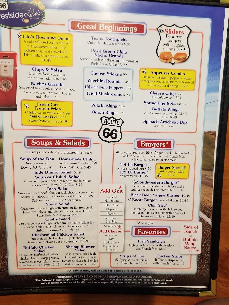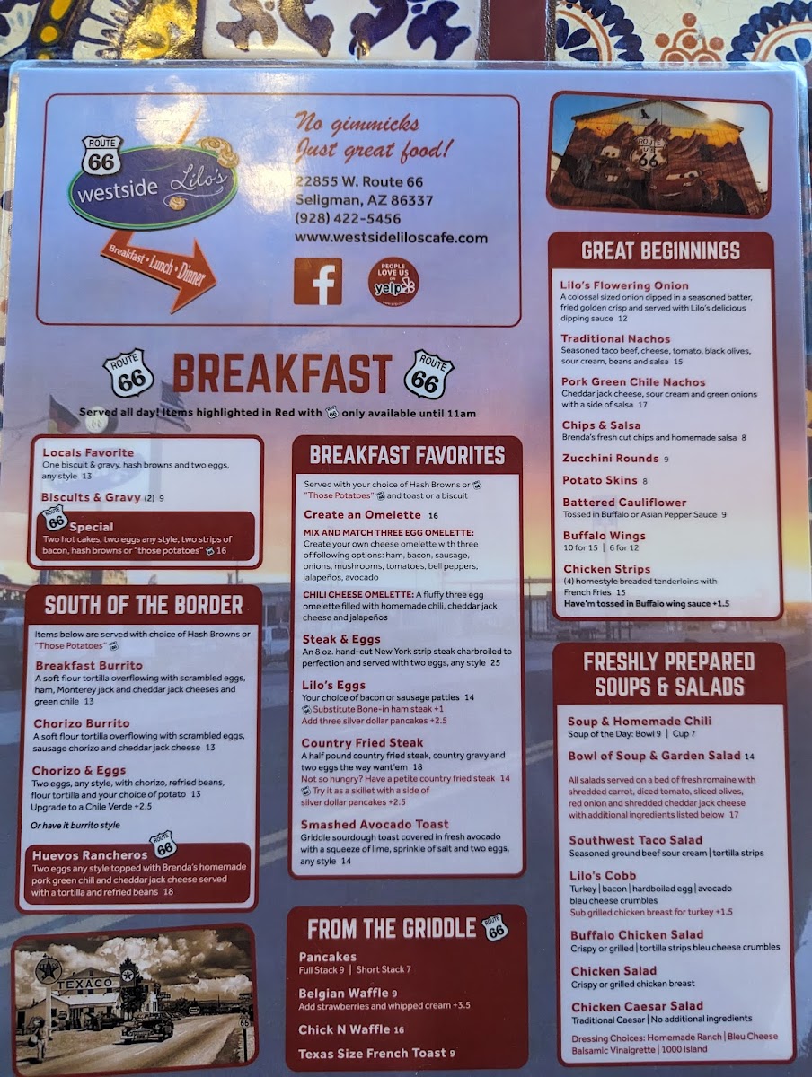 Welcome to Westside Lilo's Cafe, a delightful dining gem nestled along the historic Route 66 in Seligman, Arizona. This charming cafe offers a cozy atmosphere where warmth and friendliness abound, making it an ideal pit stop for travelers and locals alike.